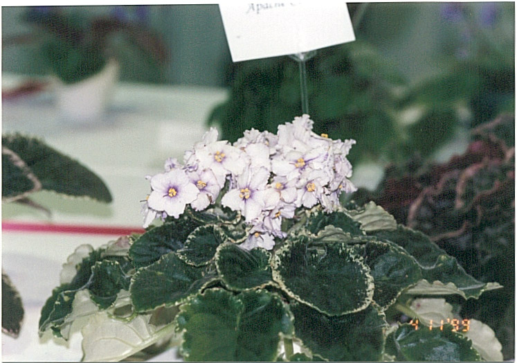 半重瓣星型花,白色皺邊,有深藍色的眼,變異的淡紫色線條,花瓣端較深色。 深綠色和白色組合的斑葉。標準型。