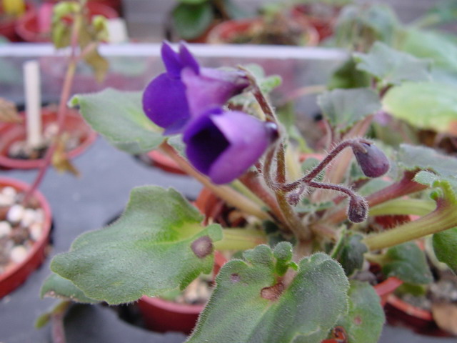 M. Gall Single blue bell/white shading. Dark green, glossy. Miniature. 單瓣的藍色鈴鐺花,偶有白色夾雜。深綠色光滑葉面。迷你型。