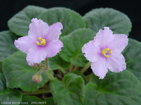 ANZ1992,Hams Single white large frilled star/ pink eye. Medium green, quilted. Standard. 單瓣大朵星型花,白色底有粉紅色眼。中綠色葉,葉脈向上氣狀突起。標準型。