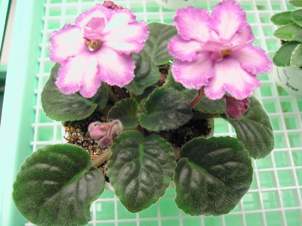 7572,11/7/91,S. Sorano Semidouble light lavender wavy star/darker eye, edge. Medium green, plain, quilted. Standard. 半重瓣亮薰衣草色皺折星形花,深色的眼和鑲邊。中綠色一般型葉,葉脈向上氣狀突起。標準型。