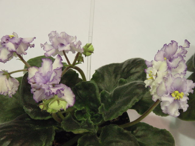 9581,1/17/06,E. Korshunova Single-semidouble white large frilled star/lilac eye, violet edge. Medium green, pointed. Standard. 單瓣到半重瓣白色大朵折邊星形花,淡紫色的眼,藍紫色的邊。中綠色尖型葉。標準型。