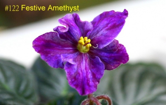 S. Sorano Semidouble amethyst/dark purple markings, variable lavender shading. Dark green, quilted. Standard. 半重瓣紫水晶色花,深紫色的暈染,變異時有薰衣草色。深綠色葉,葉脈向上氣狀突起。標準型。