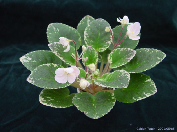 8399,3/8/96,H. Pittman Semidouble white/yellow. Variegated medium green and white, plain. Semiminiature。 半重瓣,白色中有黃色間雜, 中綠色和白色組合成的斑葉,平坦葉面。半迷你型。