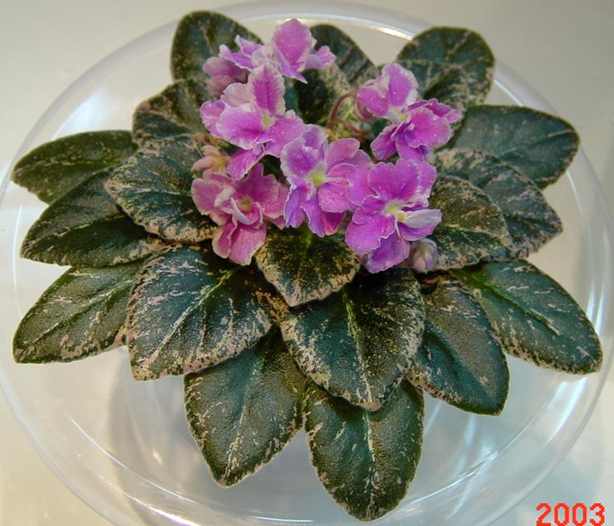 7081,2/10/89,H. Pittman Double fuchsia and white. TL variegated, pebbled, glossy, wavy. Semiminiature. 重瓣的櫻紅色和白色花。TL型斑葉,圓形葉有波浪邊,葉面光滑。半迷你型。