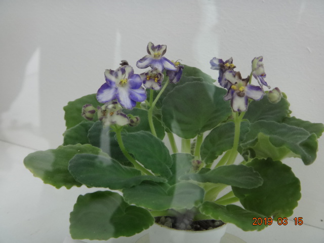 Semidouble chimera blue-purple frilled pansy/white stripe, green edge. Medium green, quilted. Semiminiature.