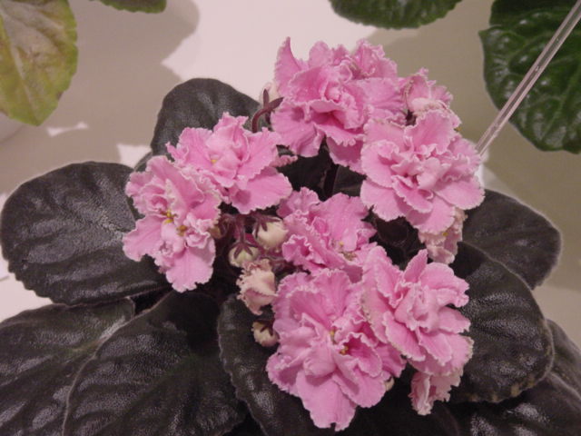 8935,1/18/01,D. Harrington Semidouble-double pink shaded pansy/variable white edge. Medium green, heart-shaped, quilted. Standard. 半重瓣到重瓣的粉紅色堇型花,變異時有白鑲邊。中綠色心形葉,葉脈向上氣狀突起。標準型。