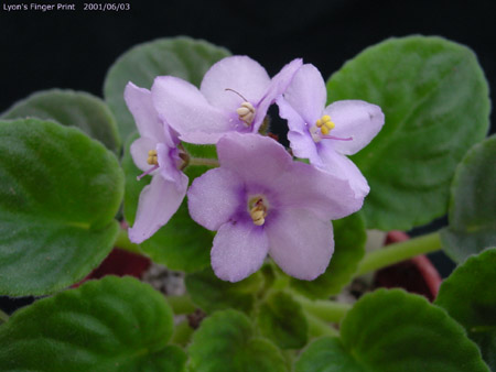S. Sorano Single-semidouble white pansy/orchid patches on lower petals, variable on top petals. Medium green, plain. Standard. 單瓣到半重瓣的菫型花,白色底,蘭花色的斑塊出現在下面花瓣端,有時有變異也出現在上花瓣端。 中綠色葉,平坦葉面。標準型。
