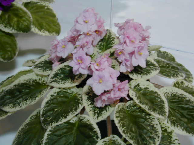 9042,5/31/01,O. Robinson Semidouble pink pansy. Variegated medium green and cream, quilted, serrated. Standard. 半重瓣的粉紅色堇型花。中綠色和奶油色組合成的斑葉,葉脈向上氣狀突起,鋸齒葉緣。標準型。