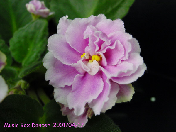 半重瓣~重瓣的大朵星型花,玫瑰粉色底,寬的白色邊。 中綠色葉,葉面凹凸。標準型。
