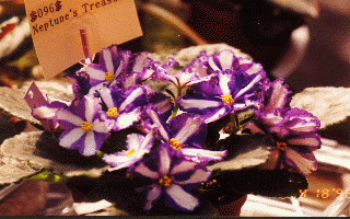 S. Sorano Semidouble medium blue large ruffled star/white stripe. Medium green. Standard。 半重瓣縐折縞花,大型中藍色底白色內縞,星形花。中綠色葉。標準型。