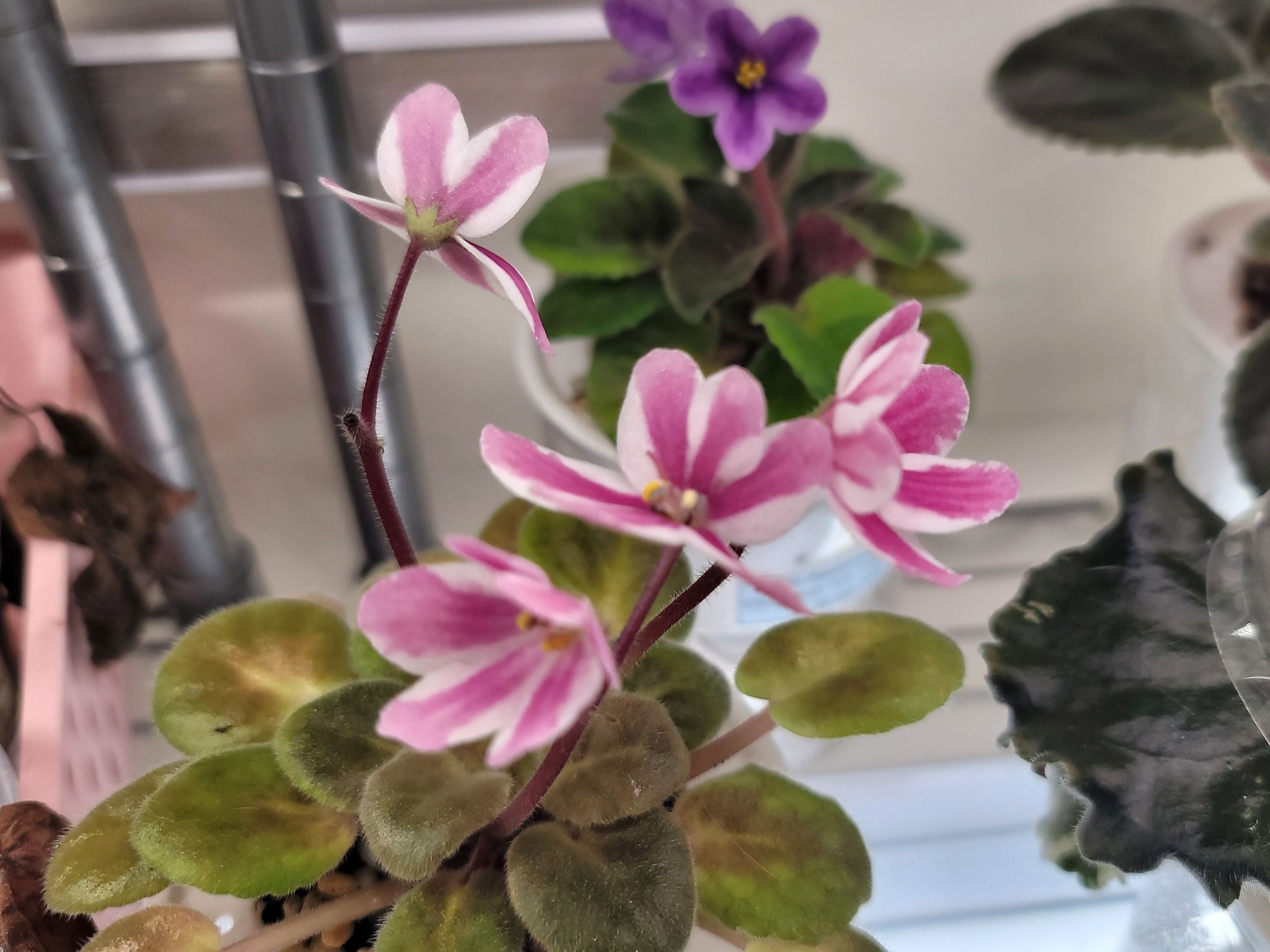 半重瓣堇形俄系縞花,白色底粉紅內縞。 中綠色亮色葉,葉脈向上氣狀突起。標準型。(資料來自Lyndon Lyon網站英文描述翻譯之)