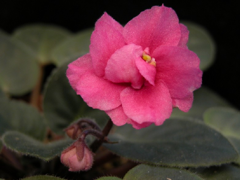 S. Sorano Semidouble vivid pink star. Black-green/red back. Semiminiature. 半重瓣的搶眼粉紅色星形花。近黑的綠色葉,紅色葉背。半迷你型。