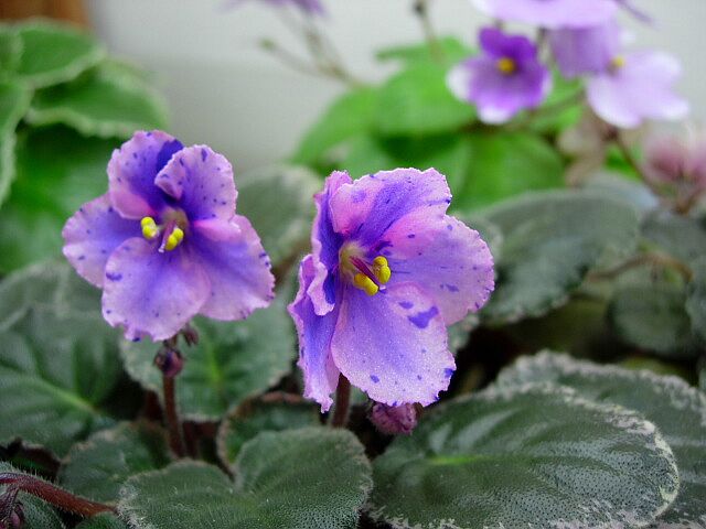 半重瓣堇型折邊縞花,粉紅色底,藍色內縞和一些小斑點。