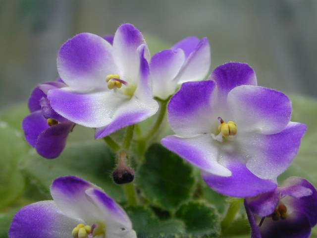 Single white sticktite pansy/plum patches. Variegated medium green and cream, heart-shaped. Semiminiature.