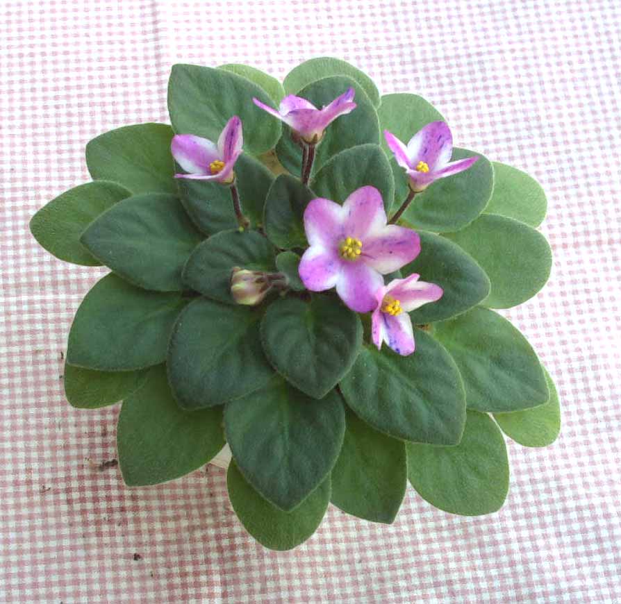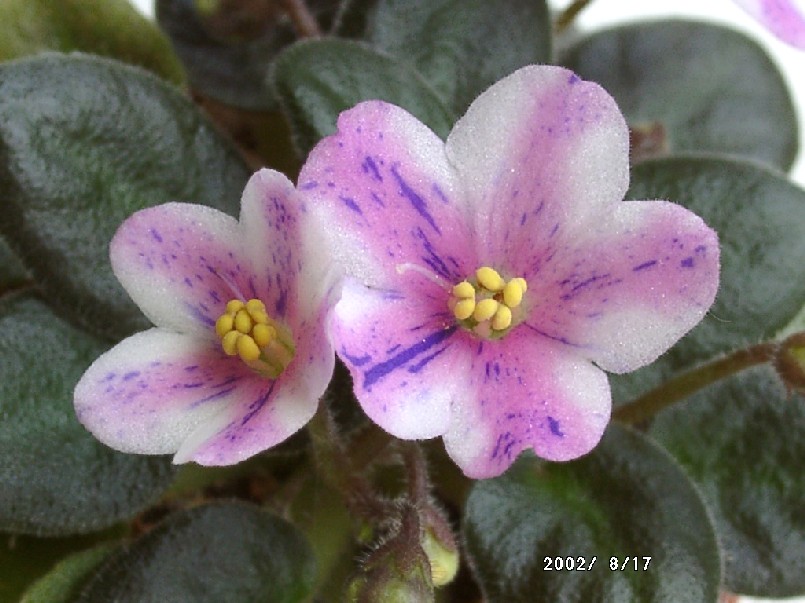 8173,6/5/95,R. Robinson Single chimera white star/pink and blue fantasy stripe. Medium green, pointed. Miniature. 單瓣星型縞花,白色為底,粉紅色和藍色的噴點內縞。中綠色尖型葉。迷你型。