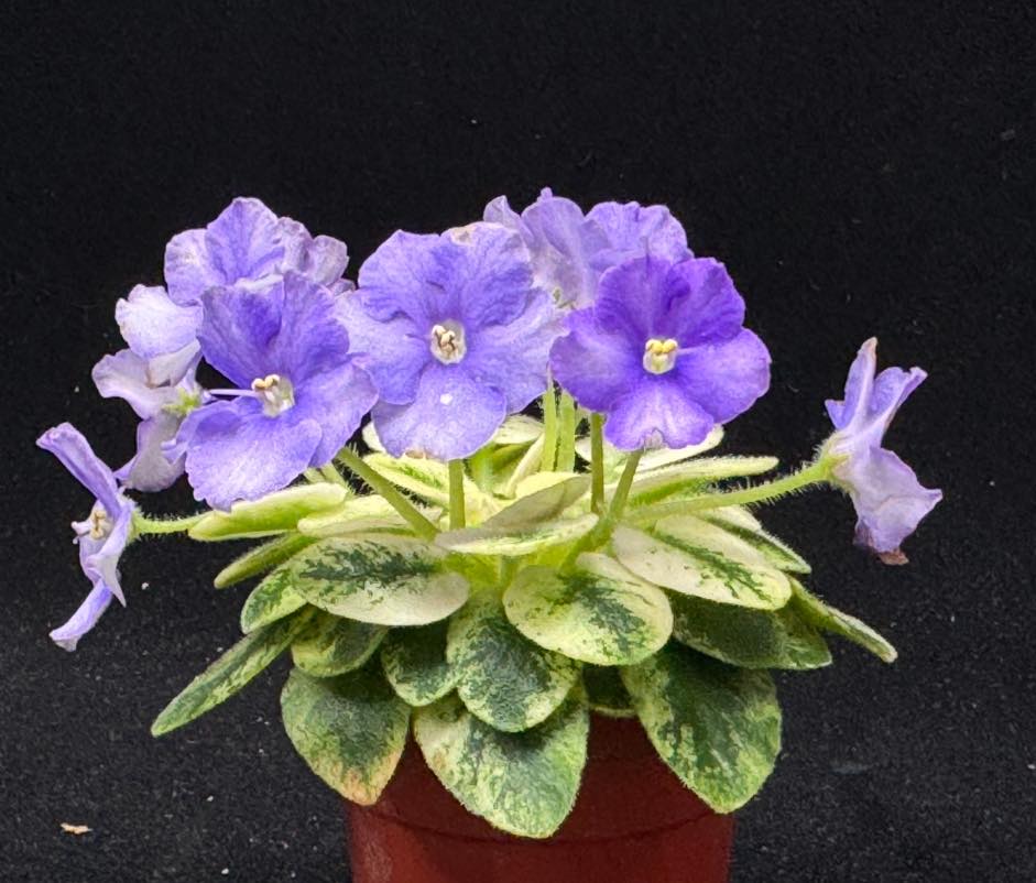 Semidouble white ruffled pansy/wide blue edge. Crown variegated medium green and white, pointed, wavy. Semiminiature.