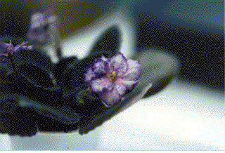 7891,6/2/93,R. Robinson Double pink sticktite pansy/blue fantasy, dark red-purple ruffled edge. Dark green, serrated/red back. Semiminiature. 重瓣,粉紅色有藍色噴點,鑲紅紫色皺折邊的不掉落菫型花, 深綠色葉,鋸齒邊,紅色的葉背。半迷你型。