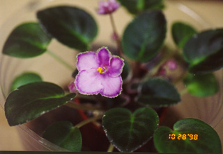 深綠色和白色組合的斑葉,凹凸葉脈,鋸齒葉緣,紅色葉背。半迷你型。