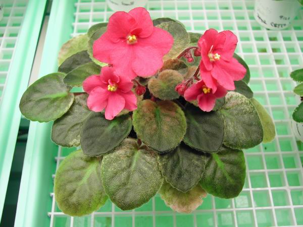 9040,5/31/01,R. Robinson Semidouble dark coral pansy. Crown variegated dark green, white, cream and pink, quilted. Semiminiature. 半重瓣深珊瑚色堇型花。深綠色和白色,奶油色,粉紅色組合成的皇冠狀斑葉,葉脈向上氣狀突起。半迷你型。