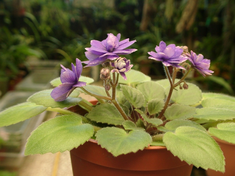 重瓣不掉落的花,白色底,藍邊。 中綠色葉,尖型葉,葉面光滑,鋸齒葉緣。迷你型。