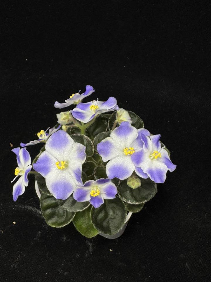 9372,9/30/04,S. Sanders Single purple pansy/white eye. Variegated medium green and white, heart-shaped. Miniature. 單瓣深紫色堇型花,白眼。中綠色和白色組合成的心型斑葉。迷你型。