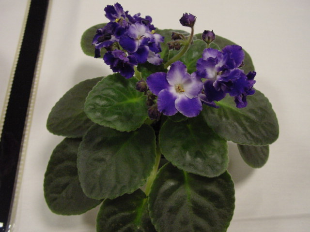 9987,6/19/08,J. Jackson Semidouble medium blue two-tone frilled pansy/white eye. Medium green, heart-shaped, quilted. Small standard. 半重瓣的深淺不一中藍色堇型花,花心有白色的眼。中綠色心型葉,葉脈向上氣狀突起。比標準型稍小的小標準型。