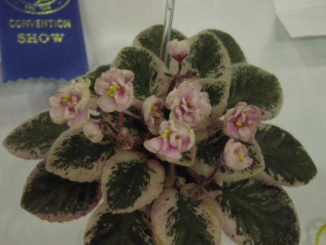 9414,5/6/05,D. Hoover Semidouble-double medium pink pansy/ white edge. Variegated medium green, pink and white, plain/ red back. Semiminiature. 半重瓣到重瓣的中粉紅色堇型花,白色鑲邊。 中綠色,粉紅色和白色組合成的平坦斑葉,紅色葉背。半迷你型。