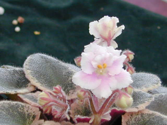 6829,1/25/88,H. Pittman Semidouble fuchsia/wide white edge. TL variegated dark green, plain/red back. Semiminiature. 半重瓣櫻紅色花,白色寬鑲邊。 深綠色的TL形斑葉,一般葉型,紅色葉背。半迷你品。
