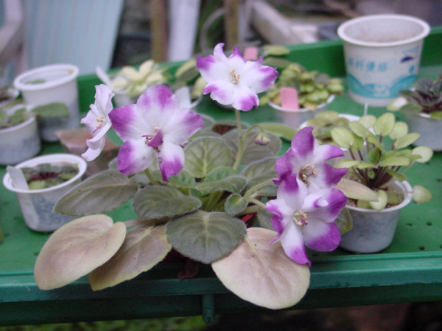 單瓣不掉落的星型花,白色底,紅紫色的花瓣端。 中綠色葉。標準型。
