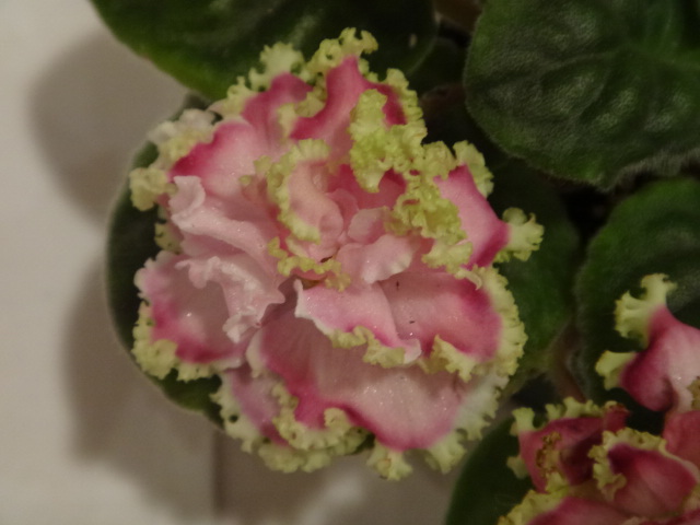 半重瓣到重瓣的粉紅色折邊星形花,覆盆子色變異寬邊,白綠色細邊。中綠色蛋型葉。標準型。