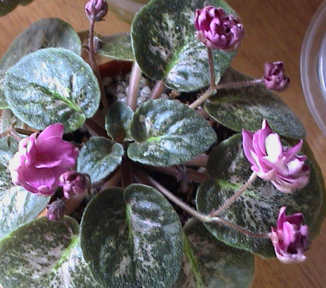 J. Gehr Double burgundy/near-black tips. Mosaic variegated dark green and silver. Standard. 重瓣葡萄酒色花,花瓣端有近乎黑色的顏色。深綠色和銀白色組合成的馬賽克斑葉。標準型。